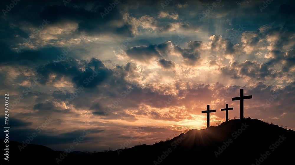 A serene landscape of three crosses on a hill at sunset with a cloudy sky #1929770722