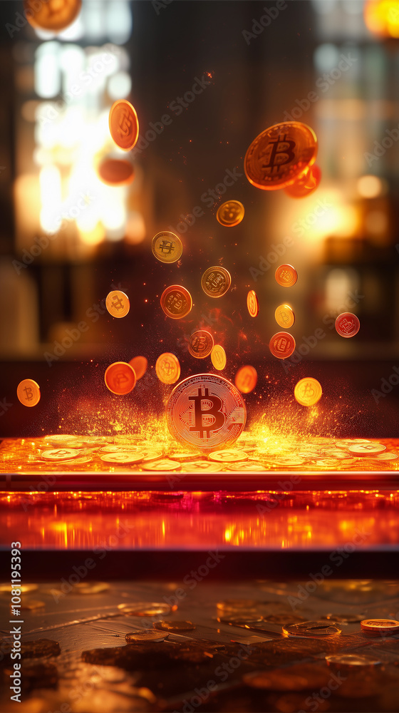 a smartphone with fire and an explosion of bitcoin coins in a bullish cryptocurrency market #1081195393