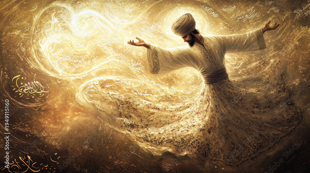 A stylized Sufi dervish dancing in the wind, deep spiritual connection concept #1949115160