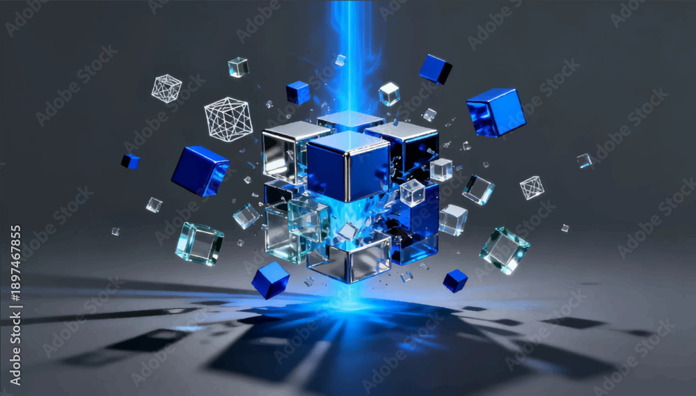 A vector 3D illustration depicting the deconstruction of a technological cube that breaks down into smaller pieces. #1897467855