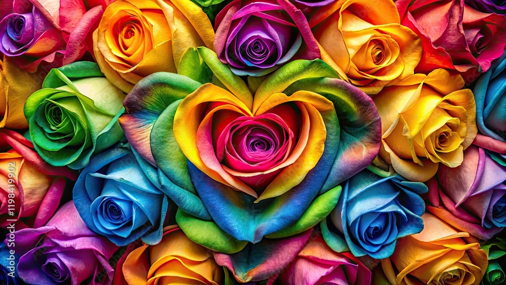 A vibrant rainbow rose heart, romantically arranged, captures love's colorful beauty in artistic floral photography. #1198419902