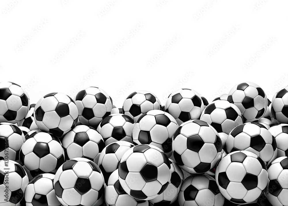 A wide border of stacked, black silhouette soccer balls against a pristine white background; a dramatic sports image. #1306751051