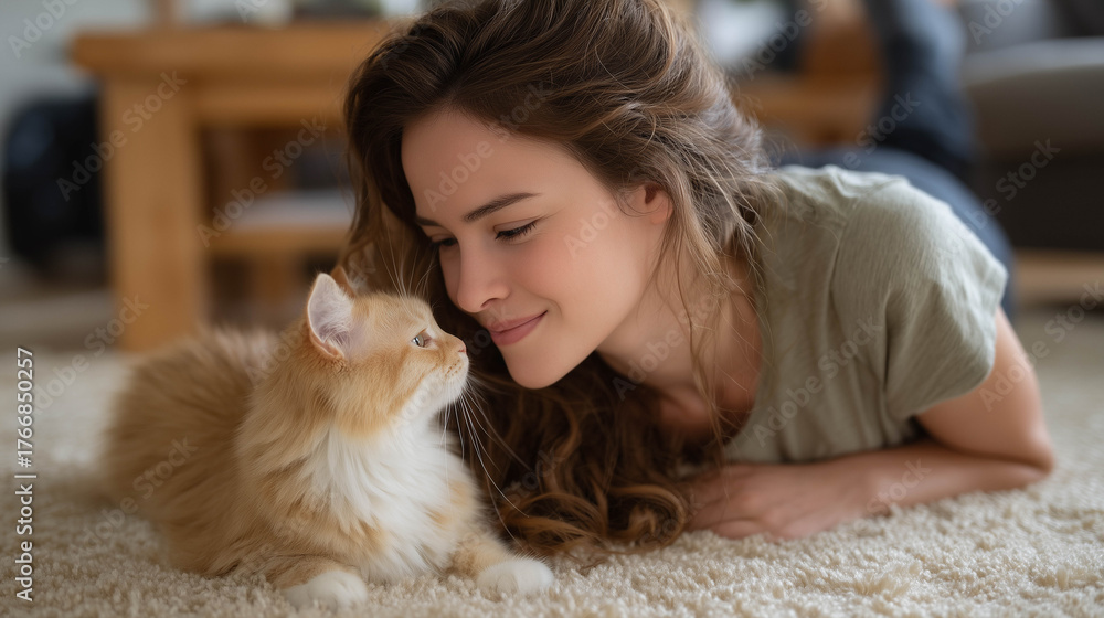 A woman lying on a soft carpet with her cat, nose-to-nose in a loving and playful interaction. #1766850257