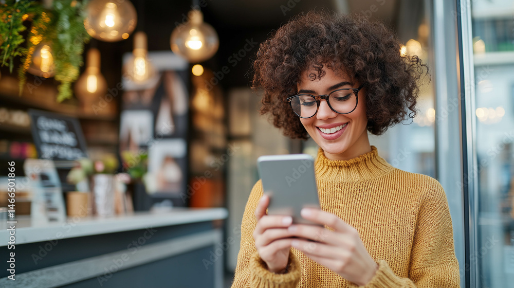 A woman using a smartphone to browse an online article, smiling and happy. #1466501866