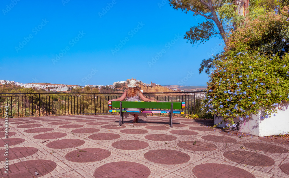 A woman wearing a sun hat sits on a colorful bench at the Mirador de Abades viewpoint with panoramic views of the Castle of the Dukes and Arcos de la Frontera, Cádiz, Spain. #1968804954