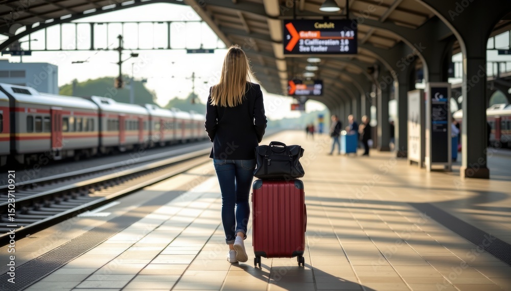 A woman with a suitcase waits on a train platform, ready to travel, with trains and a station sign in the background. #1523710921