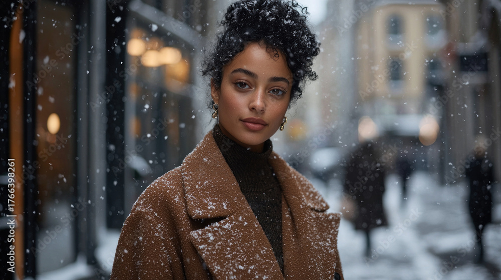 A woman with curly hair in a winter coat poses on a snowy city street #1766398261