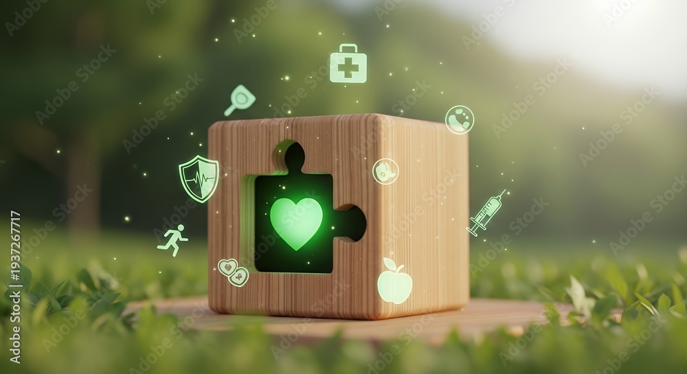 A wooden cube with a glowing heart puzzle piece surrounded by health icons outdoors. #1937267717