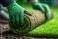 a worker wearing green gloves is laying new grass on the lawn they carefully place each square of vibrant green sod close-up Generative AI #1914471860
