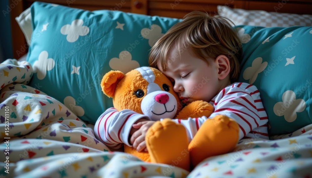 A young child peacefully sleeps in bed, cuddling a plush orange teddy bear under colorful, patterned blankets. #1523711101
