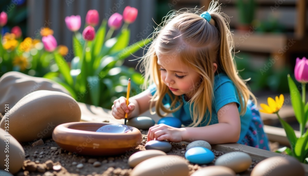 A young girl paints rocks in a vibrant garden surrounded by colorful flowers and sunlight, enjoying a creative outdoor activity. #1523711021