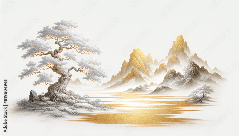 Abstract art traditional Chinese nature landscape scene an ancient tree on rocky mountains luxury style gold black and white tones on white background with copy space. #819604961