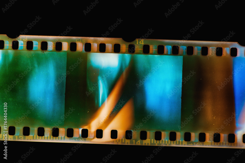 Abstract color film texture background with grain, dust and light leak, framed isolated on free black background with copy space. #1764404330