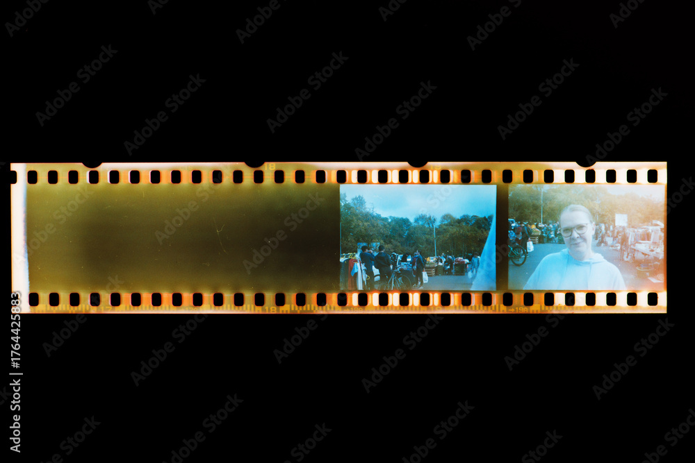 Abstract color film texture background with grain, dust and light leak, framed isolated on free black background with copy space. #1764425883