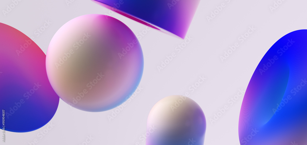 • #1939548366 Dynamic 3d rendering floating geometric shapes with rainbow holographic gradient. Modern abstract composition on light background for technology and art design.