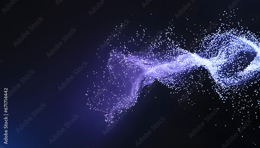 Abstract flowing fluid light particles purple and blue on black background in concept technology, science, space, universe. #671714442