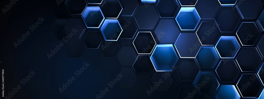 Abstract futuristic digital geometric technology hexagon background banner illustration - Dark blue glowing hexagonal 3d shape texture (Generative Ai) #604771856