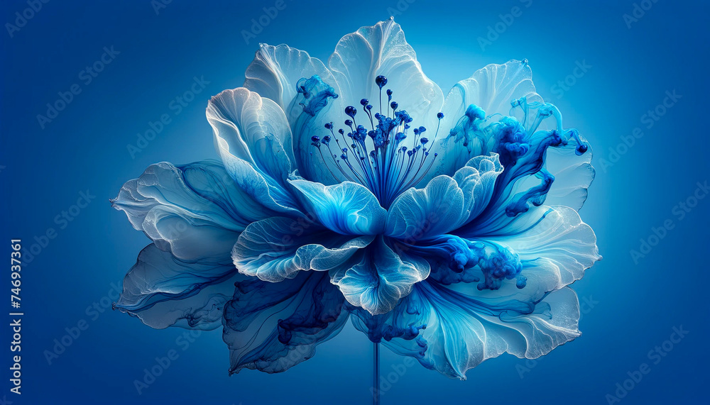 Abstract single blue flower blooming by transparent liquid fluid ink petal on blue background. 3D render style in studio light. #746937361