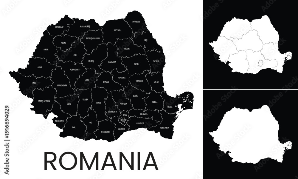 Administrative division map of Romania, black outline of the country isolated on white background, vector illustration #1916694029