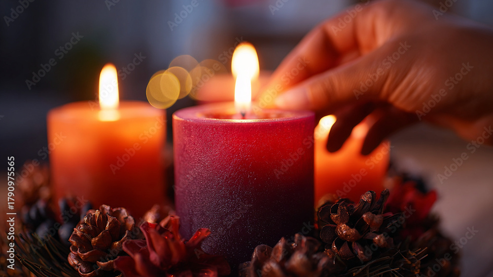 Advent calendar. Burning candles with Christmas decorations. Lighting candles. #1790975565
