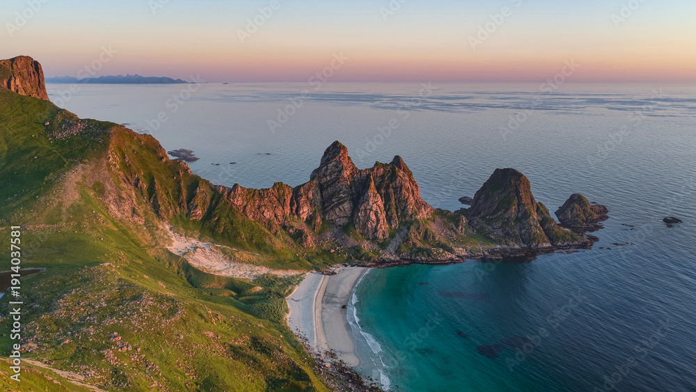 aerial, bird view Amazing rock formations near Matind, Måtind mountain, Otervika Beach near Bleik on Vesterålen, vesteralen islands during midnight sun. Sunset, Beautiful hiking destination in arctic #1914037581