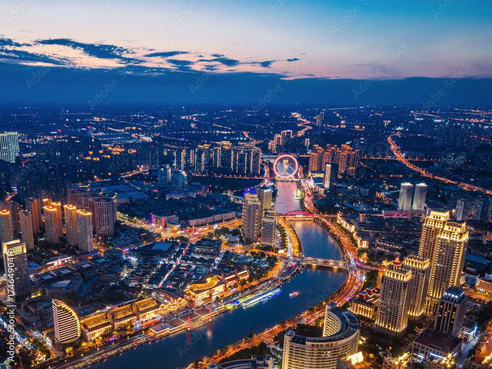 Aerial night view of Tianjin Eye Ferris wheel and city skyline in Tianjin, China #1746490410