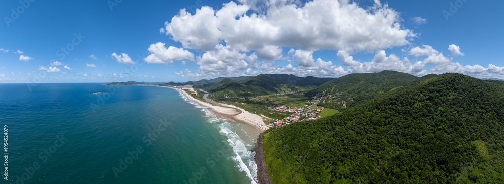 Aerial panorama of the tropical beach, little town and hidden in the green hilly terrain. Town of Siriu, Santa Catarina, Brazil #1954524079