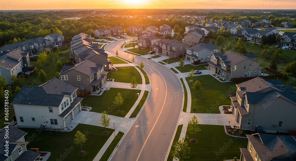 Aerial sunset scene of curving contemporary American neighborhood street with newly constructed single family residences in the East Coast United States #1601781450