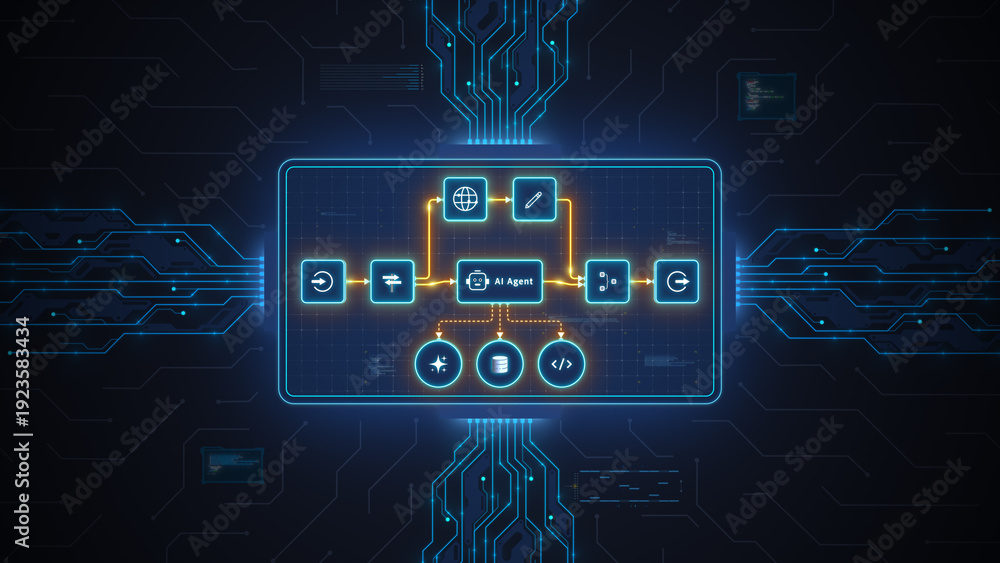 AI agent automation workflow interface with connected nodes on futuristic digital dashboard technology #1923583434