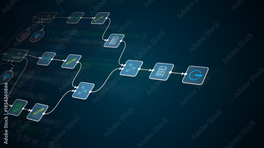 AI automation workflow diagram with agents, cloud computing, and process flow on digital code background #1854360866