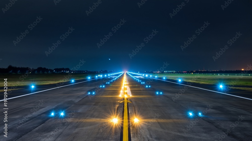airport runway lights perspective view glowing blue and yellow guiding lines night scene #1970942004