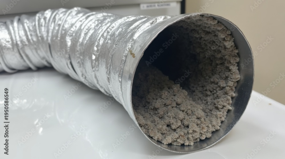 Aluminum dryer vent tube clogged with gray lint accumulation. Flexible metal pipe shows buildup from clothes drying. Needs cleaning for safety and efficiency. #1950586549