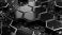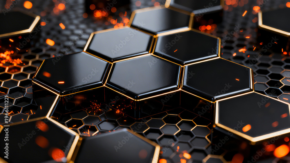An abstract futuristic composition featuring a layout of interconnected glossy black hexagonal shapes #1966111221
