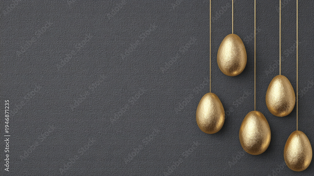 An Easter card.A garland of golden Easter eggs on a gray background. #1946871235