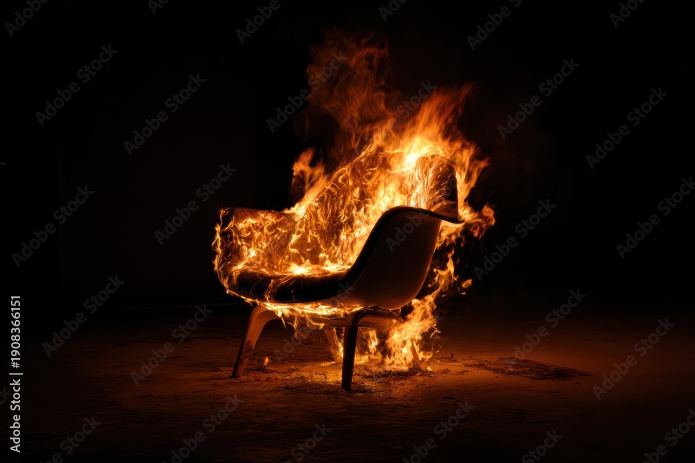 An iconic modern designer chair engulfed in flames, recognizable silhouette, fire sculpting the form, dark studio setting, high contrast lighting, contemporary art photography #1908366151