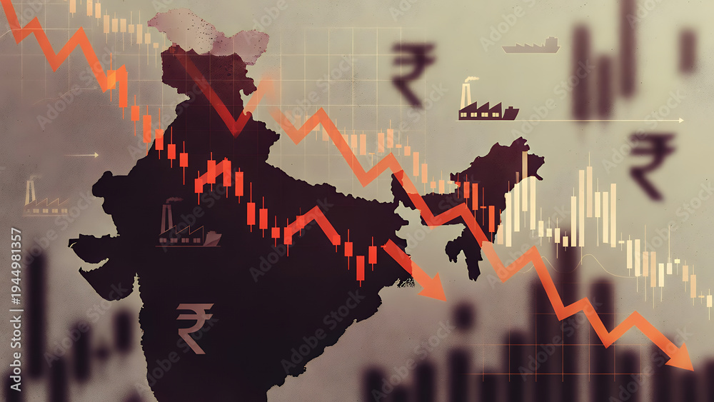 An Indian map with factories and rupee symbols shows a severe economic downturn. #1944981357