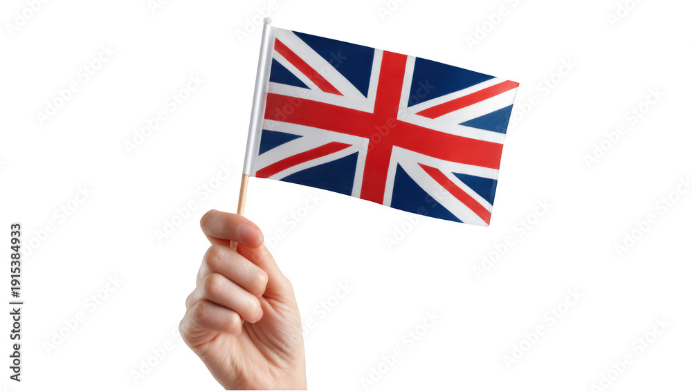Animation rising United kingdom flag on hand png isolated object background for country history purpose. #1915384933