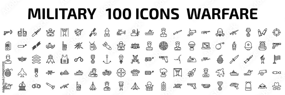 army and war outline icon set. 100 linear vector for ui, web and mobile. thin line gun shooting, two way radio, military knife and more icons. #1960432858