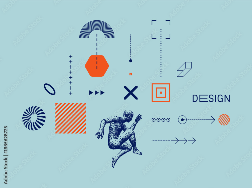 Art composition. Geometric shapes. 3d model of man. Dance party invitation. Dancer. Illustration composed of particles. Vector for brochure, poster, presentation, flyer or banner. #1965628725