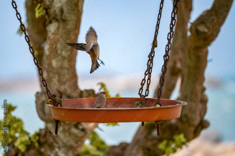 Astrilds ondulés et moineaux du Cap dans et autour d'une mangeoire à oiseaux #1764102770
