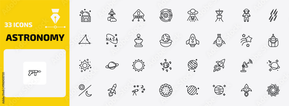 astronomy outline icon set. 33 linear vector for ui, web and mobile. thin line planetarium, liftoff, lander and more icons. #1960438730