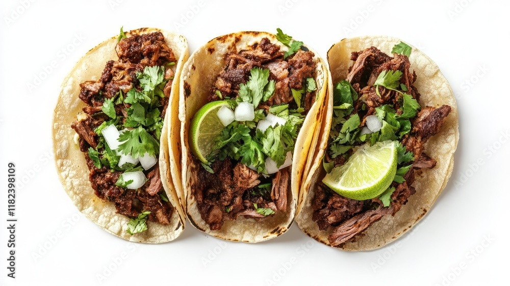 authentic mexican barbacoa tacos with fresh garnishes overhead view of traditional street food isolated on clean white background with soft shadows #1182398109