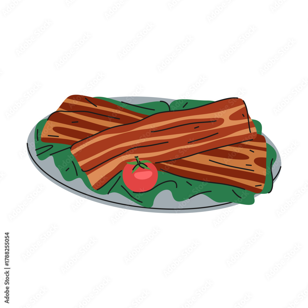 Bacon meat or American, English food on plate. Vector crispy fired pork slice served for breakfast or brunch meal. Side dish icon for salty cuisine. Snack or garnish. Grilled meal strips. Culinary. #1788255054