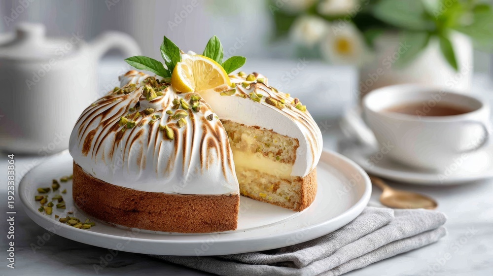Baked Alaska style dessert featuring glossy golden meringue and frozen lemon cream center. #1923383864