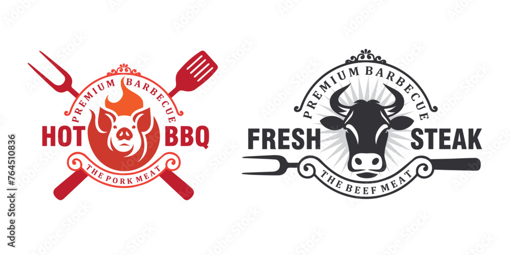 barbeque grill bbq barbecue emblem badge set vintage logo vector graphic template #764510836