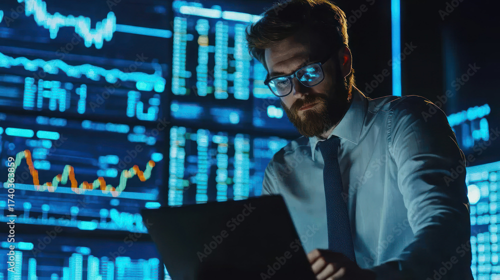 Bearded man in glasses analyzes data on a laptop, surrounded by multiple glowing screens #1740363859