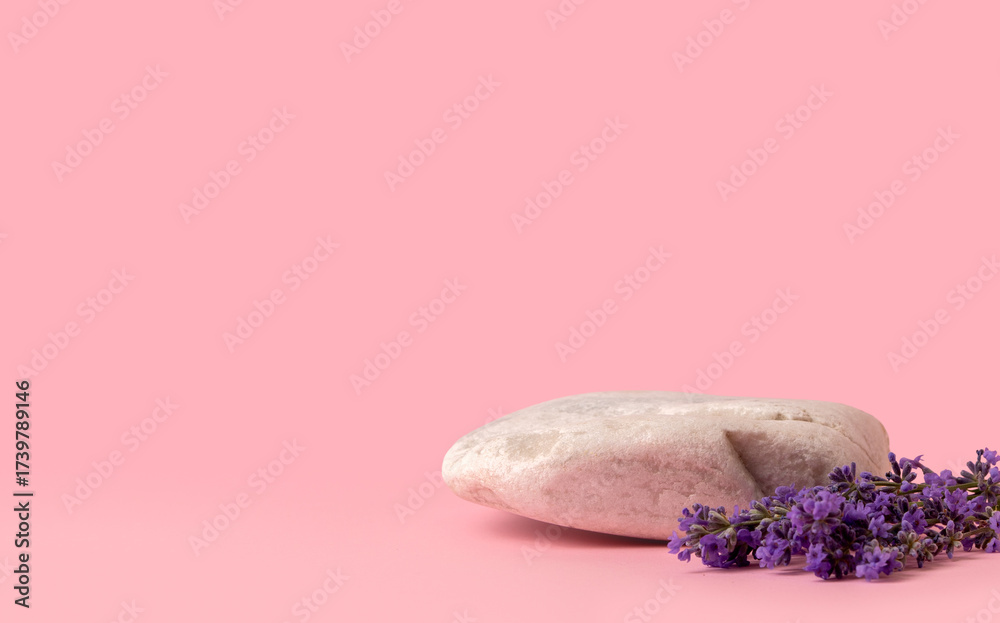 Beauty cosmetics product presentation scene made with lilac flowers and stone on soft pink background with copy space #1739789146