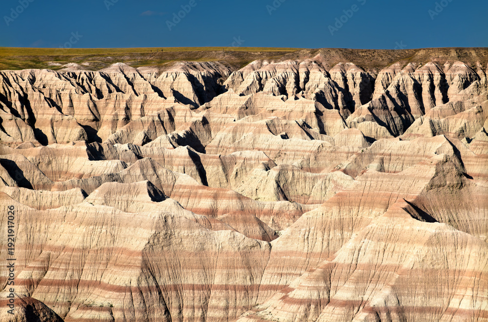 Big Badlands Overlook in Badlands National Park, South Dakota. Scenic landscape features vast eroded layered rock formations of the Badlands Wall under a blue sky #1921917026