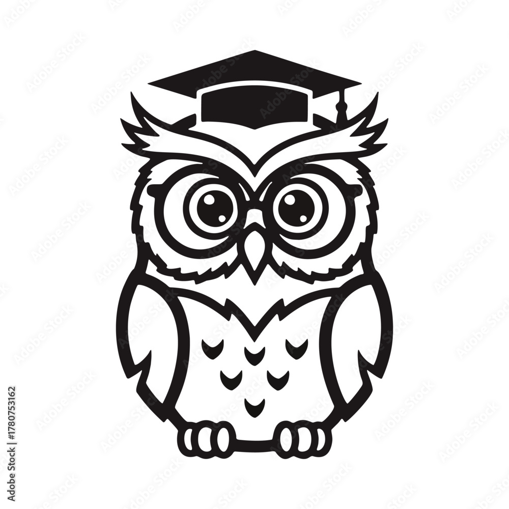 Black and white illustration of a wise owl wearing a graduation cap and glasses, symbolizing knowledge and education. #1780753162