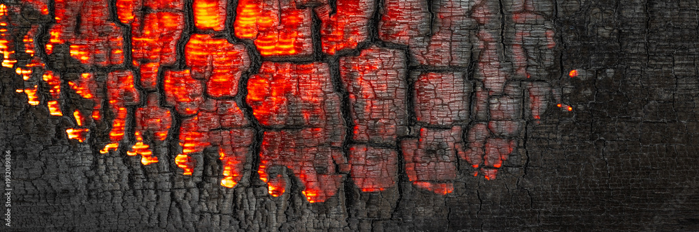 Black charred and scorched wood with glowing embers background #1932089836